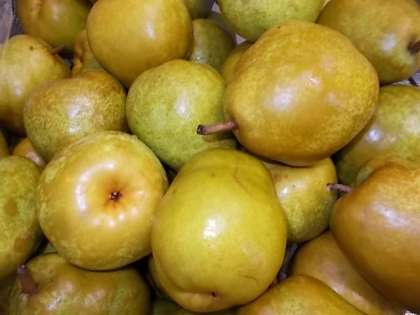 今日の西洋ナシは「ラ・フランス」です。メロンのように追熟が必要な西洋ナシは常温(15〜20度)で置いておき、甘いにおいがして軸の周りに少し皺がよってやわらかくなったころが食べごろです。