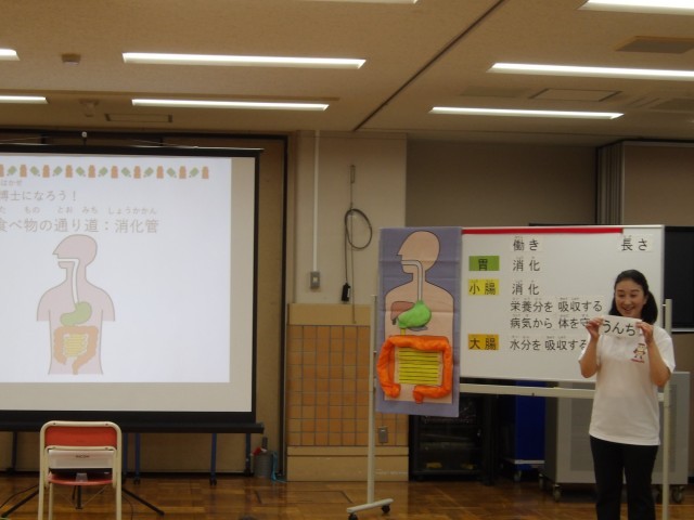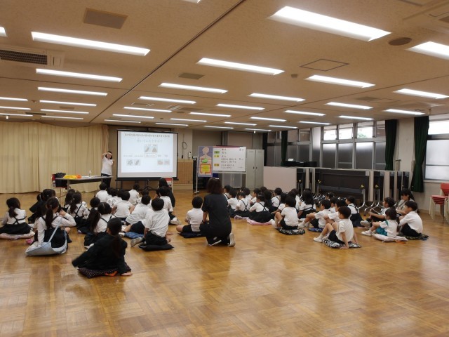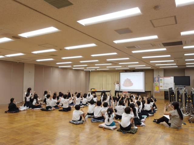 10月7日(火)の2校時に、1年生を対象にヤクルトおなか元気教室を行いました。これは、「早ね、早おき、朝ごはん、朝うんち」をテーマとして、正しい食習慣・生活習慣を身につけることをねらいとしてヤクルトが実施している出張授業です。当日は、小腸や大腸の長さや働き、うんちの状態から分かる健康の様子などを、講師の先生からスライドなどを見ながら説明を受けました。とても分かりやすい内容で、子供たちも集中して聞いていました。