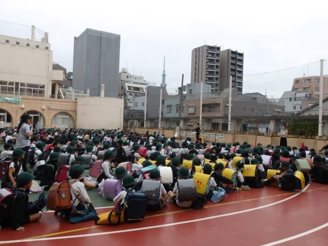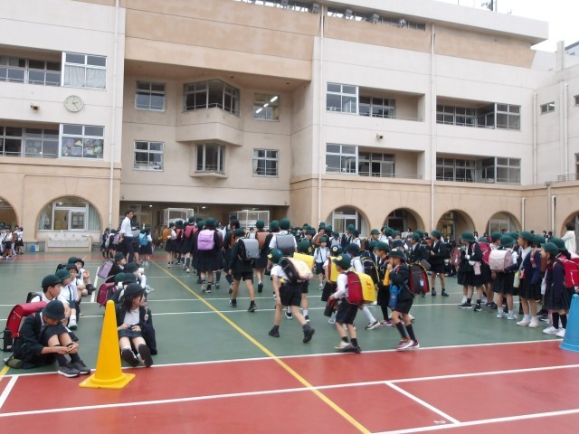 10月8日(水)に、年間行事の予定通り集団下校を実施しました。色別のコースごとに集まって副校長先生からのお話を聞いた後、放課後こどもクラブや各学童クラブの子たちは並び直し、それぞれ担当の教員の引率、見守りのもと下校しました。集団下校の意味をしっかり理解して、気を付けながら帰っていた子が多く、とても素晴らしいと思いました。