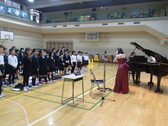 11月12日(水)2~4校時に、フルーティストの忍田結梨さんと、ピアニストの島田湧真さんをお招きして、音楽鑑賞教室を行いました。忍田先生は大正小ご出身ということもあり、大正小での思い出を交えながらお話をしてくださったり、先生の人生をテーマに、「パートオブユアワールド」「ルパン三世」「チャルダッシュ」等の演奏をしてくださったりと、内容も大変興味深く、子供達も真剣に鑑賞していました。何より、先生方の奏でるフルートとピアノデュオの音色が大変美しく、その音色に魅了された貴重な時間となりました。