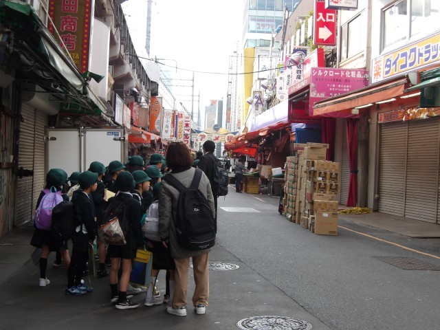 11月27日(木)に、3年生はスクールバスで社会科見学に行きました。3年生の社会科は主に区の学習をするので、区内の様々な場所を見学しました。訪れたのは、アメ横→したまちミュージアム→上野公園→仏壇通り・合羽橋商店街(バスの車窓から見学)→リバーサイドスポーツセンター(含昼食)→浅草寺・仲見世・二天門でした。どこも他区の児童がバスや電車を使って見学に来るような所なので、台東区の児童は恵まれていると感じました。子供たちは話を真剣に聞いたり、写真やメモを一生懸命とったりして、よい見学になったと思いました。