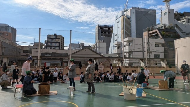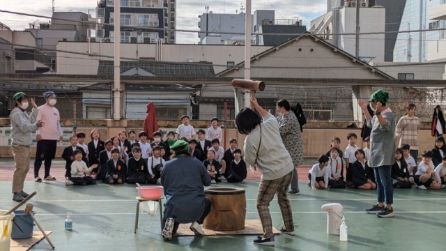 「よいしょー!」という元気な掛け声とともに、子どもたちや先生方が順番に杵を振り下ろし、会場は活気に包まれていました。