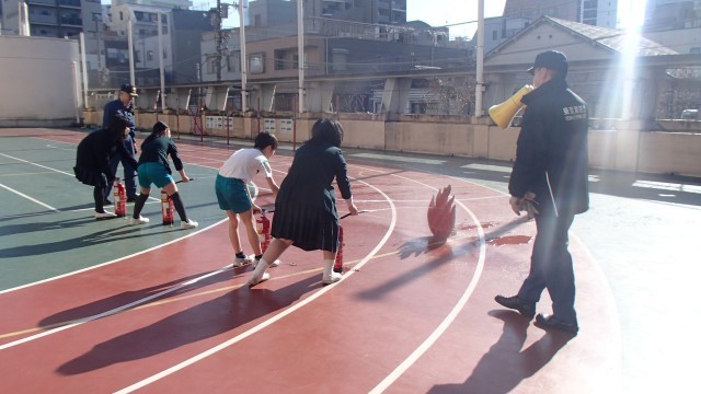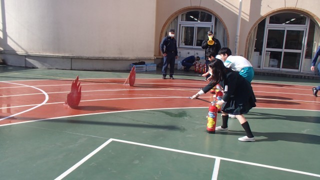 12月の全校の避難訓練後、6年生が上野消防署下谷出張所の方から、消火器の使い方を教わりました。