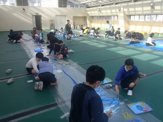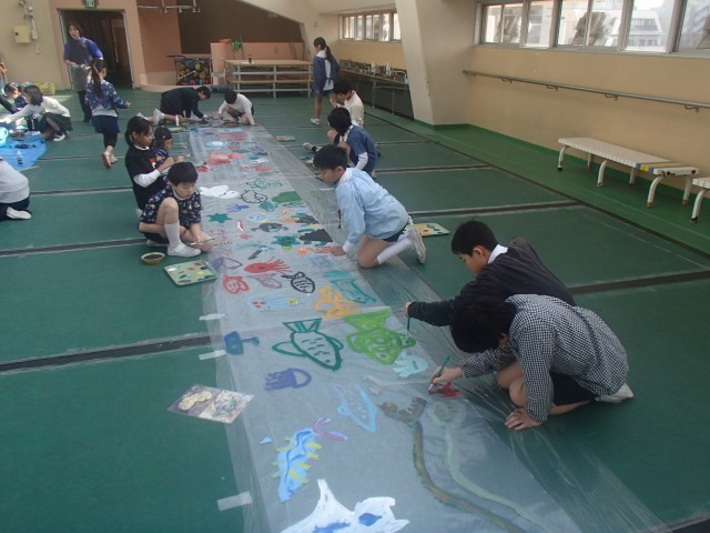 透明なビニール素材に絵の具で海の生き物、波、船、海藻などを、みんなで描き描き!
