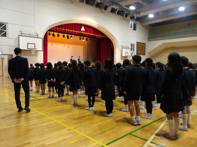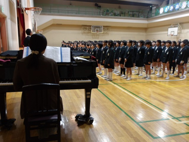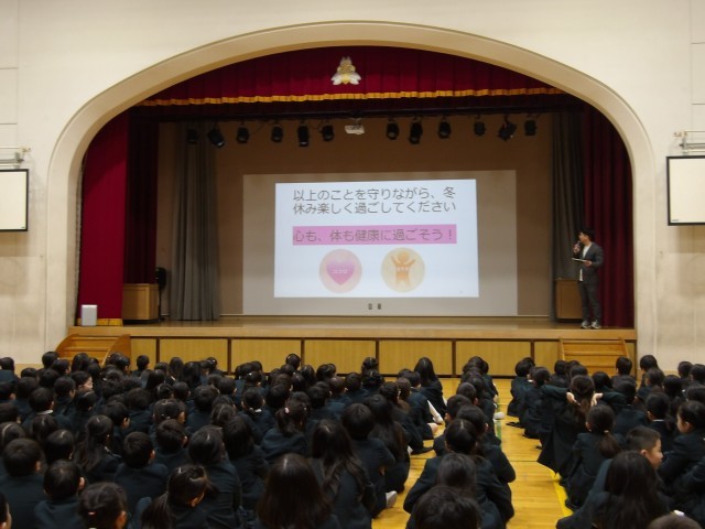 12月25日(木)に、2学期の終業式を行いました。全校児童が体育館に時間通りに集まり、開始まで静かに整列して待つことができました。開式後も、全員が式らしい緊張感をもって臨むことができていて、大変素晴らしいと思いました。式の後には、図工関連などの表彰と冬休みに向けた生活指導の話もありました。2学期も大きなけがや事故もなく過ごせてよかったと思いました。