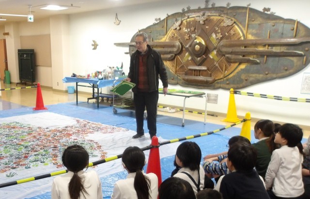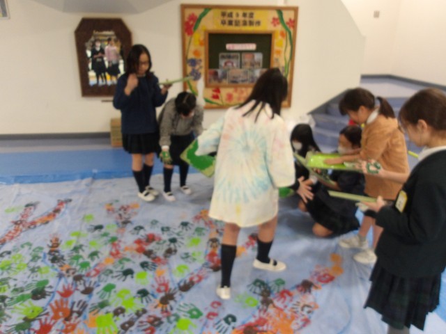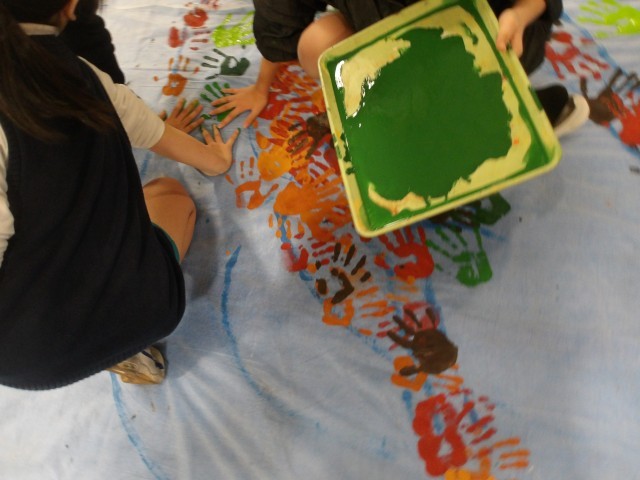 手に絵の具を付けて、一人一人の手形を使って作品を完成させました。