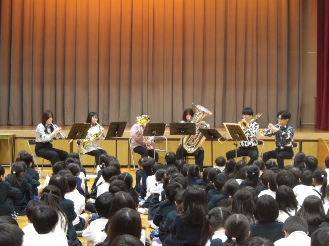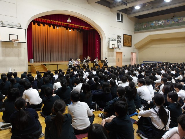 1月30日(金)の4校時に、全学年を対象として、大正小学校の体育館で音楽鑑賞教室を開催しました。当日は東京芸術大学から6名の方をお呼びして、金管6重奏を聞かせていただきました。古典からアニメの曲まで、様々なレパートリーの曲を素敵な音色で楽しませてくれました。子供たちの質問にもお答えいただき、とてもよい時間を過ごすことができました。