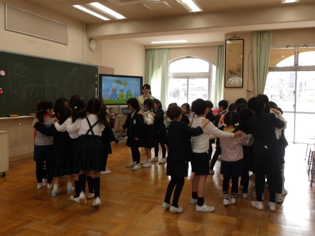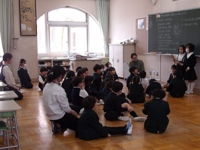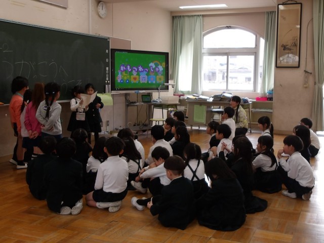 2月27日(金)に、大正幼稚園の5歳児クラスの園児の皆さんを招いて、1年生との交流会を実施しました。1組と2組に分かれ、小学校の学習の体験やじゃんけん列車などのゲームをして楽しみました。1年生なりに会の進め方を考え、司会進行や始め・終わりの言葉などを分担して準備を頑張り、素敵な会にすることができました。