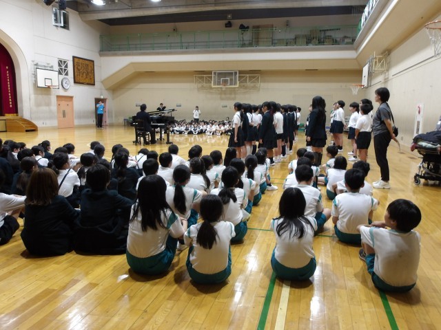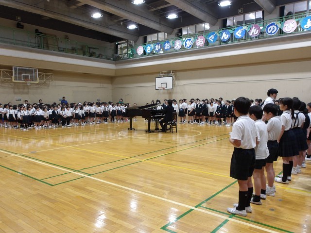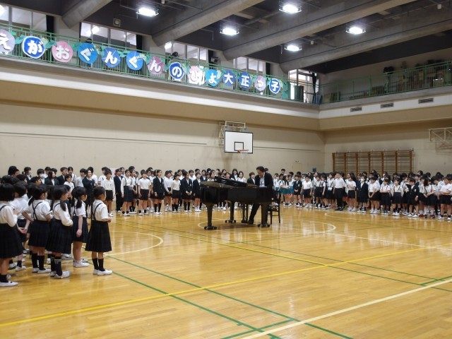 4月21日(火)の昼の時間に、今年度1回目の音楽昼会を行いました。ピアノを中心に囲んで歌う新しい隊形で、全校で校歌を歌いました。6年生が見本として素敵な歌声を響かせてくれて、1~5年生もそれにならって歌う練習をしました。体育館に素敵な歌声が響き渡りました。
