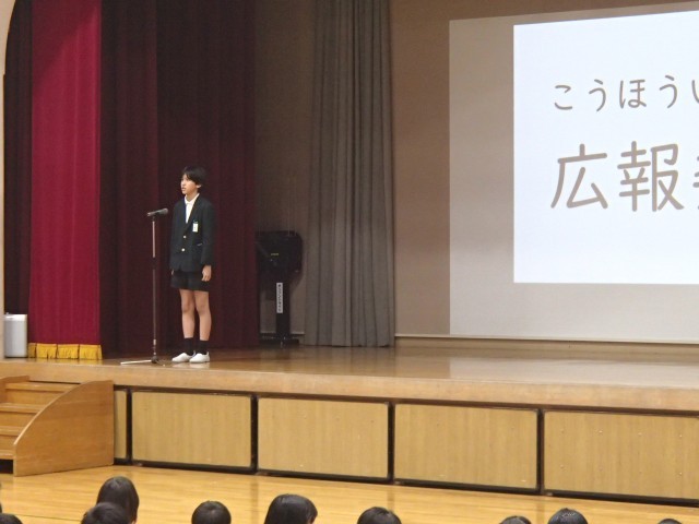 4月24日(金)の昼の時間に、それぞれの委員会の活動内容を、各委員長(6年生)が全校児童に紹介しました。