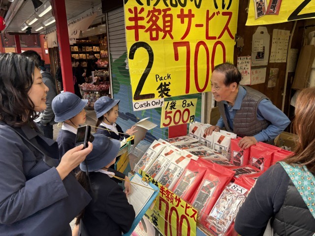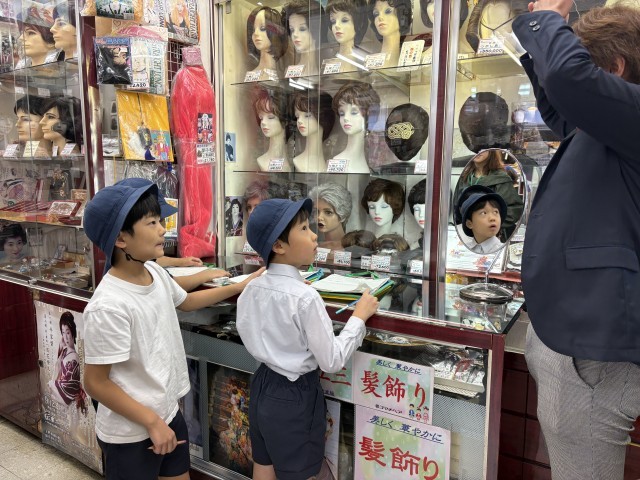 今日は待ちに待った「町たんけん」の日。頑張って準備した質問をしています。