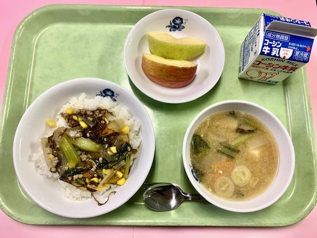 調理員の方々によく洗ってもらい、りんごの違いが分かりやすいよう、皮を剥かずに提供しました。