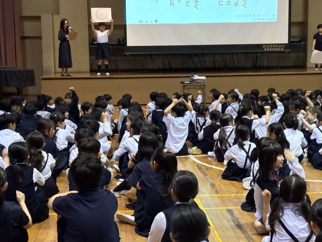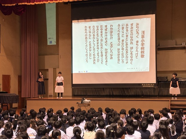 今日は浅草小学校が大切に歌い繋いでいる校歌について学びました。校歌に関するマルバツクイズで盛り上がり、元気な声で校歌を斉唱しました。