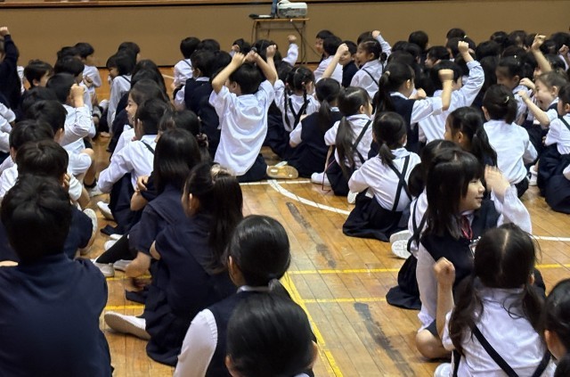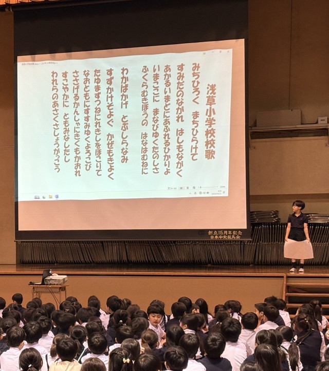 今日は浅草小学校が大切に歌い繋いでいる校歌について学びました。校歌に関するマルバツクイズで盛り上がり、元気な声で校歌を斉唱しました。