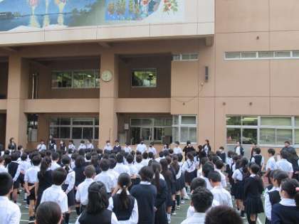 今日の全校朝会の校長先生のお話は、周年行事で歌う記念歌「未来に向かって」についてのお話でした。
