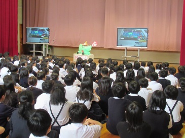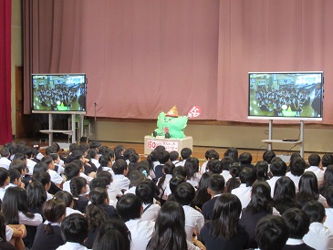 今日は、150周年記念式典のときに、お客さんたちに見ていただく、学校紹介のビデオを全校で見ました。