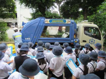 台東清掃事務所の方を講師に招き、4年生が社会科の「ごみ」についての学習をしました。スケルトンのごみ収集車で収集車の中を見ることができ、驚きの声が上がりました。ごみの処理の仕方などを学び、ごみと自分たちの生活について考えを深めることができました。