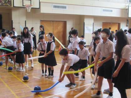 なかよし班に分かれて、すいか割りゲームを楽しみました。相手を思いやる言葉をかけて、すいかまで導き・・・うまく割れたかな??