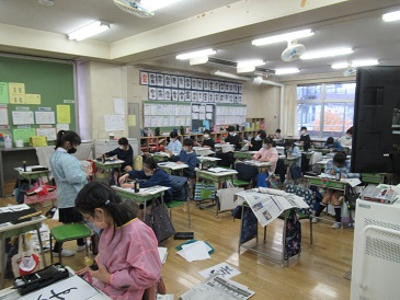 4年生の書写(毛筆習字)は1,2組一緒に、オープンスペースまで広く使って行いました。ひらがなを書く時の力加減や筆づかい、結びの書き方に気を付けて、じっくりと取り組むことができました。