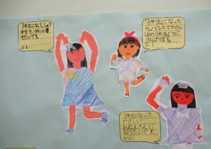絵の具と色鉛筆の表現技法を工夫して体を描き、めあてを吹き出しに書きました。2年生としての生活も、残り2か月ほどとなりましたが、1日1日を大切にして、3年生に向けて成長してほしいと願っています。