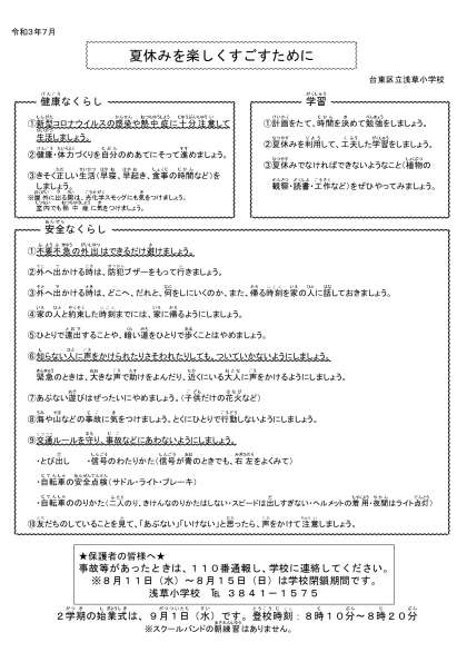 緊急事態宣言下での夏休みになりますが、健康や安全に気を付け、有意義に過ごしてください。