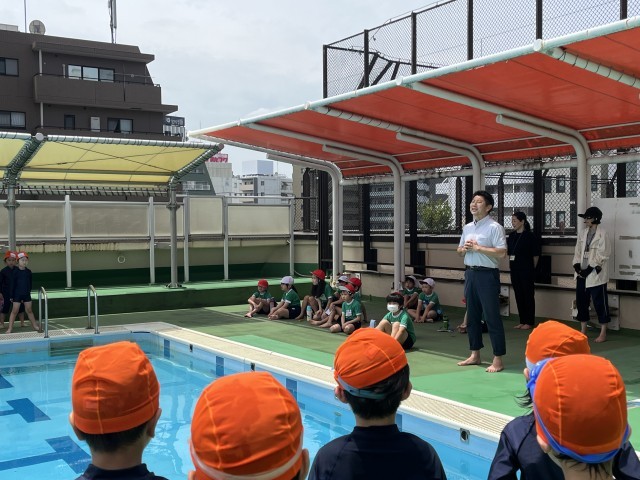 前に立つ先生のお話をよく聞いて、みんな楽しく水慣れをしました。ただ少し水が冷たく感じたかな?来週はもっと気温が上がり暖かくなると思うので、たくさん泳ぎたいと思います。