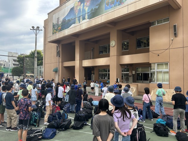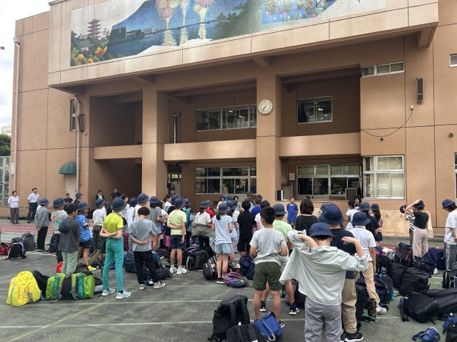 出発式を校庭で行いました。天候が心配ではありますが、心はウキウキは5年生。
