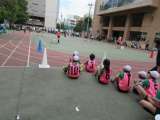 障害物競争の様子です。「万歩計を振って50回」「お玉でピンポン玉」「玉入れ」「じ...