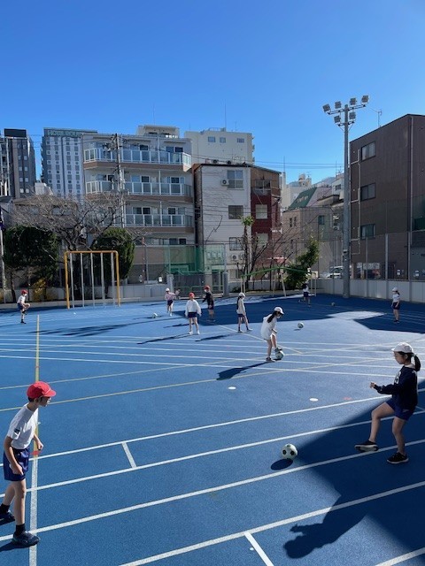 5年生は、校庭でサッカー、体育館で