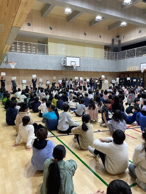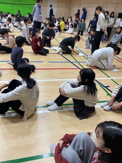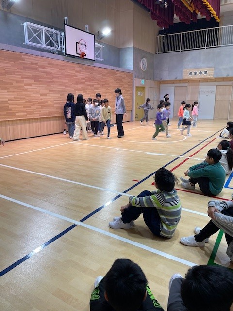 一番前の列の児童が、お題を聞いて、後ろへ回していきます。
