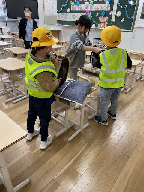 一緒にランドセルをあけて、ロッカーなどに荷物を入れ、
