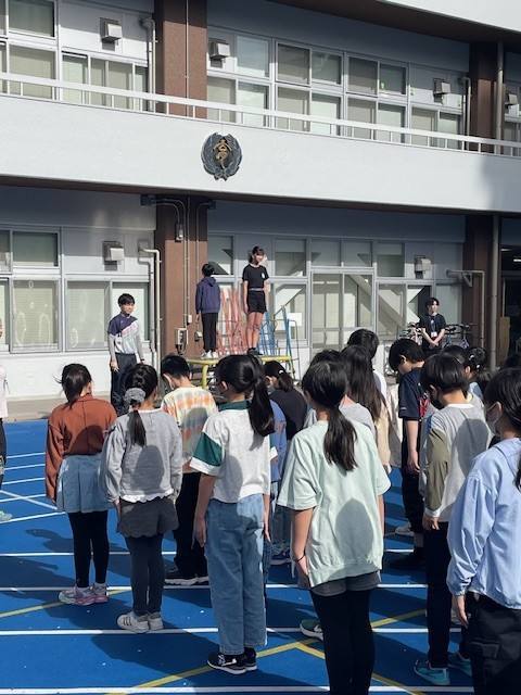 「休め」「気をつけ」「まわれ右」をお手本の6年生を見て、