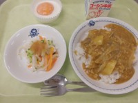 きのこカレーライス大根サラダ不思議な目玉焼き牛乳