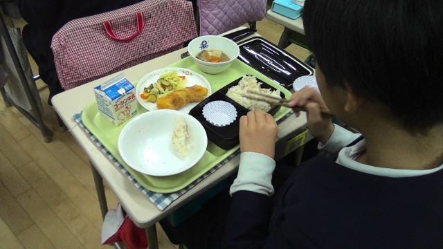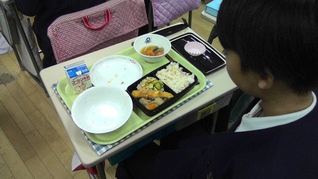献立は、おかかごはん、白身魚のフライ、野菜のそくせき漬け、なまあげと野菜の煮物。