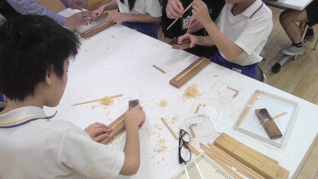 今日は、台東区の伝統工芸である江戸指物の職人の方をお招きし、3年生が箸作り体験を行いました。
