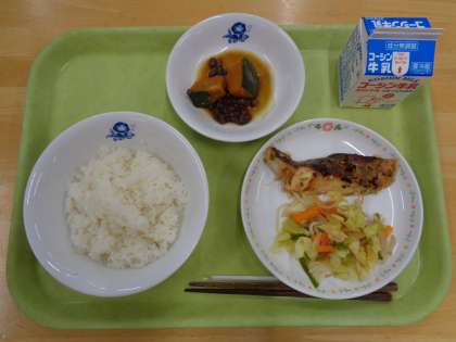 ごはん 魚のねぎみそ焼き 野菜炒め かぼちゃのいとこ煮 牛乳