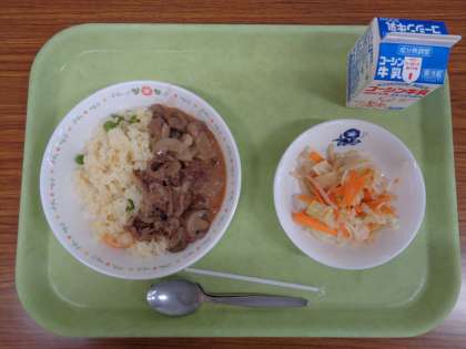 オレンジピラフ ビーフストロガノフ ゆで野菜変わりソース 牛乳
