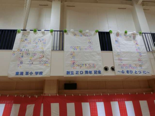 全校児童・教職員が一人一つ色を塗った「ひがのん」でできた「祝20」が飾られました。