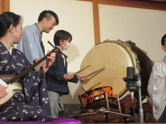 落語とは?という話や、落語の歴史の話。太鼓のたたき方の意味や出囃子について学んだあと、落語とマジックを観ることができました。また、太鼓を叩く体験もできました。