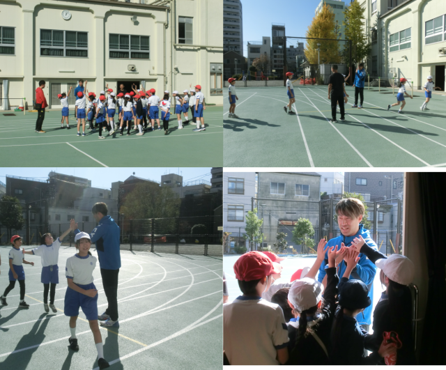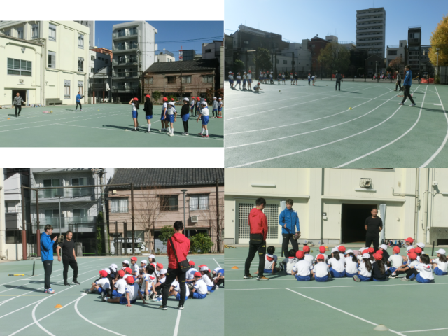 よく晴れて汗ばむくらいの陽気の中、投げ方を中心に実技体験も行い、校庭で一緒に体を動かしました。