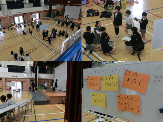 1年生は体育館いっぱいに広がって学芸会の取組。それぞれ熱心に練習に励んでいます。