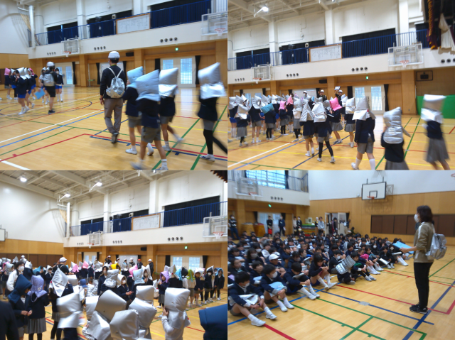 朝の準備を進めている最中の避難訓練。あわただしいですが、災害はいつ起きるか分かりません。落ち着いて行動し、出席状況の確認もすることができました。