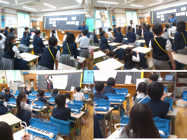 2階から活気のあるにぎやかな音がしていました。1年生は1組が英語の学習、2組が音楽の学習でけん盤ハーモニカに取り組んでいました。