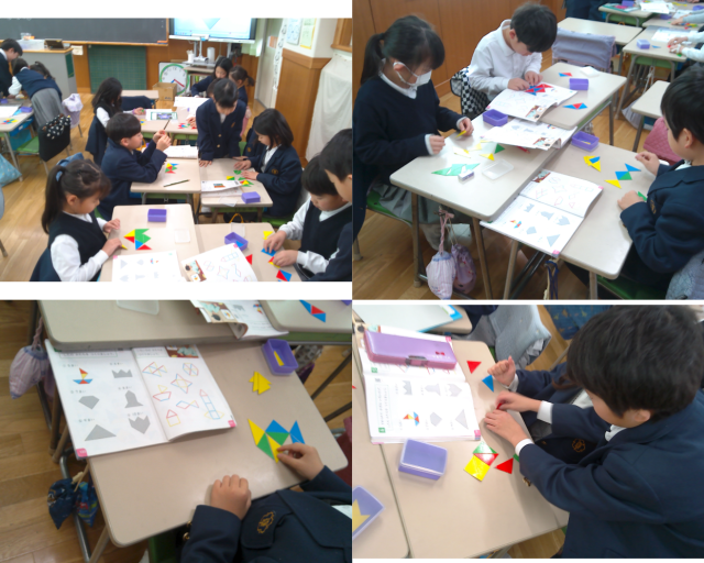 1年生の算数は色板を使ってのかたちづくり。教科書に出ているかたちを同じように並べたり、並べ方を説明したりする活動をしています。