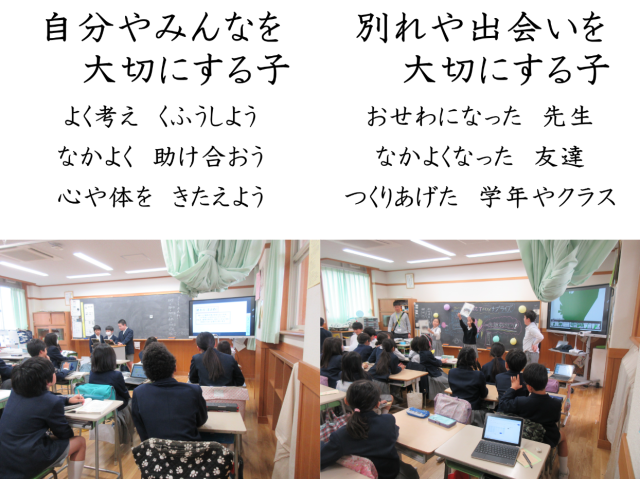 子供たちからは、すぐに教育目標である「自分や友達を大切にする子」という言葉が返ってきます。今日は「別れと出会い」も大切にする子であってほしいと話しました。