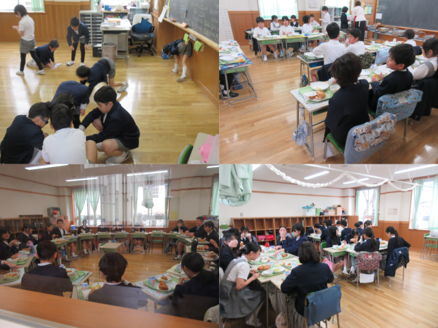 各教室では年度末でお別れする先生や友達への感謝を伝える会、これまでの学習の発表、教室の大掃除などが行われていました。各学級で最後の給食を仲良く楽しく食べている姿が見られました。