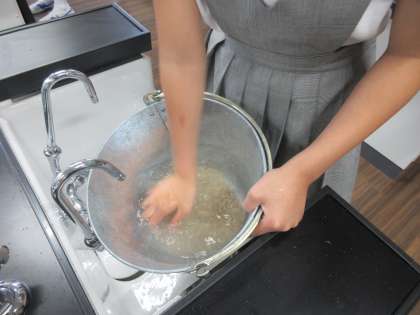 濾過器(ろかき)を作りました。珊瑚砂(さんごすな)を洗って濾過剤(ろかざい)にします。お米をとぐように,きれいに洗うことができました。「目に見える汚れ」は珊瑚砂で,「目に見えない汚れ」はバクテリアの力でそれぞれきれいにします。その後,塩やミネラルを加えて,人口の海水を作りました。