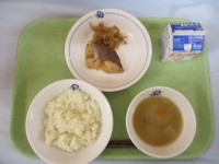 本日のメニューごはん 魚のピリ辛焼き切り干し大根のハリハリ煮 豚汁牛乳