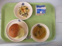 本日のメニューわかめごはん 鶏のからあげじゃがいものカレーソテー 豆腐とたまごの...