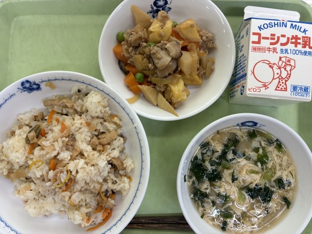 献立:牛乳、菊花寿司、野菜のそぼろ煮、かきたま汁